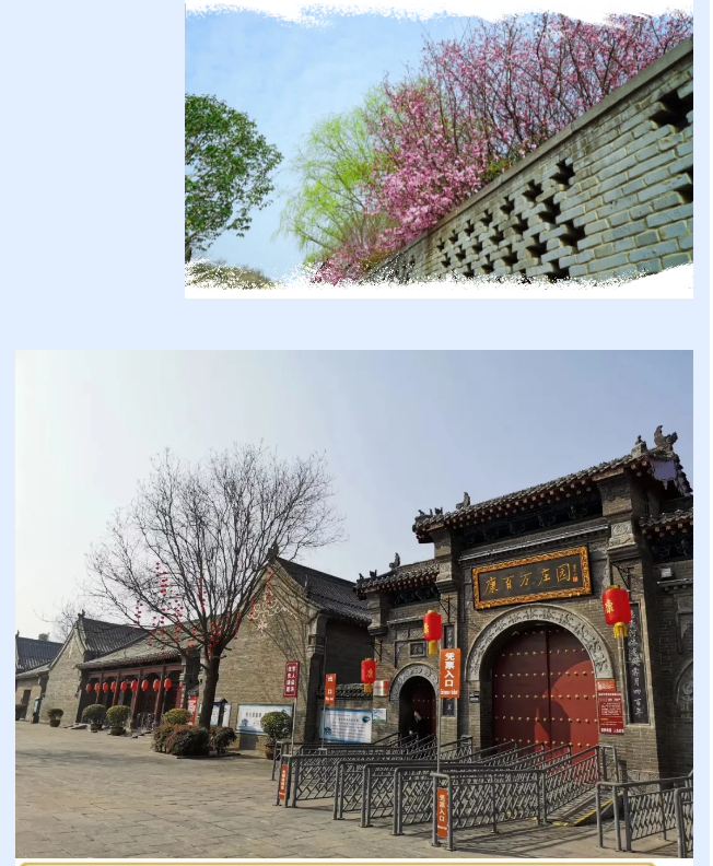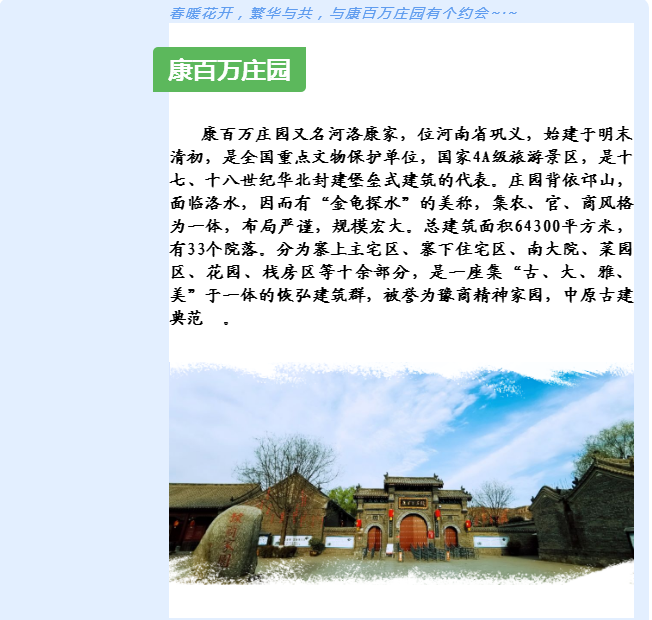 早餐后前往“全球百佳”人居环境范例奖称号的竹林镇---长寿山景区,乘观光车(小交通50元自愿自理)沿途参观天然石龙、千年古橿、万年神龟、三星宫、长生泉等景点,感受竹林风情,赏春花烂漫,长寿山有80余处人文和自然景观。可自费游玩(步步惊心,玻璃天桥,空中飞船,玻璃漂流,玻璃滑道,悬崖过山车,酷玩营地,七彩旱滑)自由参观长寿山风情古镇,品尝各种特色小吃。中餐后赴康百万庄园,国家重点文物保护单位【康百万庄园】由于它背依邙山,面临洛水,因而有“金龟探水”的美称,是中国三大庄园(刘文康百万庄园、牟二黑庄园)之一。被誉为豫商精神家园,中全原古建典范。它依“天人合一、师法自然"的传统文化选址,靠山筑窑洞,临街建楼房,濒河设码头,据险垒寨墙,建成了一个各成系统、功能齐全、布局谨慎、等级森严的、集农、官、商为一体的大型地主庄园;它的石雕、木雕、砖雕,被誉为中原艺术的奇葩。全庄园由十九部分组成,保存下来的主要有住宅区、栈房区、作坊区、南大院、祠堂区等十大部分。结束后返程,晚抵达商丘,结束愉快旅程!