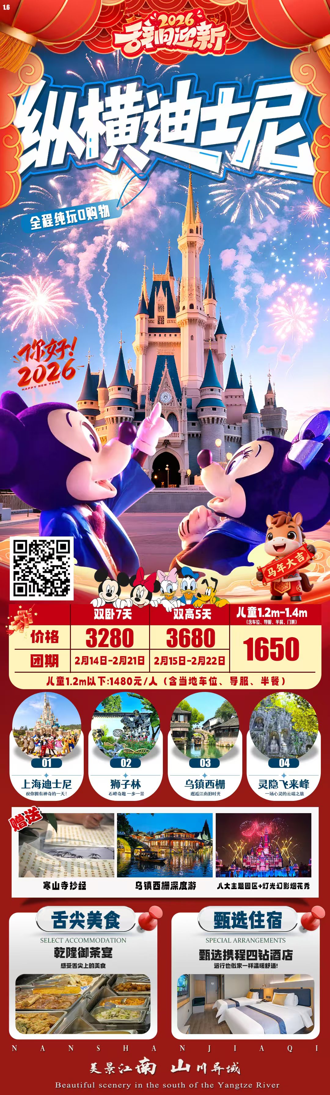 预定须知: 1:需提供每位客人正确的姓名和身份证号码。(迪士尼门票需要提前15天出票,实名制出票) 2:每天行程都有可能换车换导游 3:16周岁以下儿童请勿单独报名(须由十六周岁(含)及以上游客陪同入园) 4:迪斯尼门票报名即出票,由于线路特殊性,团款请在报名后汇至我社。出票后不能取消,更改。 |