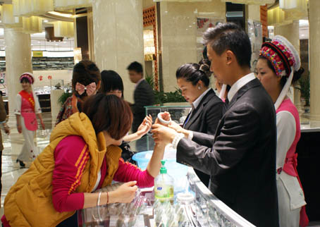 参观翡翠玉石交易中心、银饰文化中心——汽车回昆明——入住昆明 早餐后,乘车参观【翡翠玉石交易中心】(约120分钟),古语云“君子比德于玉”,玉也许是最能体现东方人细腻的宝物,莹洁碧透一如儒家的温润。炎黄子孙爱玉、佩玉的独特传统,使得中国的玉文化源远流长,也因此“君子无故,玉不去身。”这里具有原产地特惠、所购商品终身增值换购、无理由退换等多重贴心服务及品质保障,您可放心选购。之后我们将前往【银饰文化中心】(约60分钟),在银器名品的艺术宝殿中观赏其中所蕴含的精美:精细的加工工艺、细腻的生产及源远流长的历史文化将让您感受到云南少数民族的智慧。之后乘车返回昆明,品尝为您准备好的特色餐昆明迎宾宴,晚入住酒店休息。