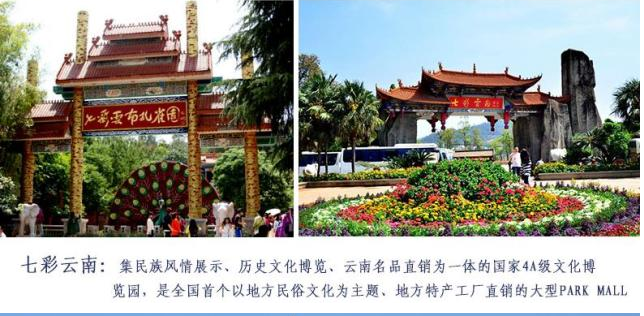 早餐后带大家前往昆明玉石文化博物馆(游览时间120分钟),【七彩云南风景区】(游览时间180分钟),茶礼文化园,还有独具云南特色的旅游商品千多种,还有精彩纷呈风情万种的民族歌舞演出。掩映在绿树林中独具民族特色的少数民族建筑,犹如浓笔重彩的山水画,七彩云南是一道美丽的风景。七彩云南旅游特点不仅在于购物,还在于其浓郁的民族建筑特色,金顶、红瓦白墙的傣族建筑和照壁翘梁辉映的白族建筑,先声夺人,倒映在波光粼粼的七彩渔缘中,形成了独树一帜的旅游特色,展现绚丽多姿的民族风情和民族民俗文化。中午品尝独具云南特色的【过桥米线】。之后前往【大观楼】(游览时间60分钟),大观楼公园,由近华浦景区、西园景区和南园景区组成。近华浦景区汇集了昆明地区明清时期的园林建筑,浓缩了昆明古代、近代园林历史文化的发展脉络,是一部栩栩如生的昆明300多年的园林发展史。园内的大观楼有300多年的历史,是公园内最重要的景观。清乾隆年间,布衣寒士孙髯翁撰写的180字长联,气势宏大,意境深远,几百年来脍炙人口,被誉为“天下第一长联”,毛泽东给予了“从古未有,别创一格”的高度评价。大观楼也因“绝世长联”而跻身“中国名楼”。晚餐后入住昆明酒店。