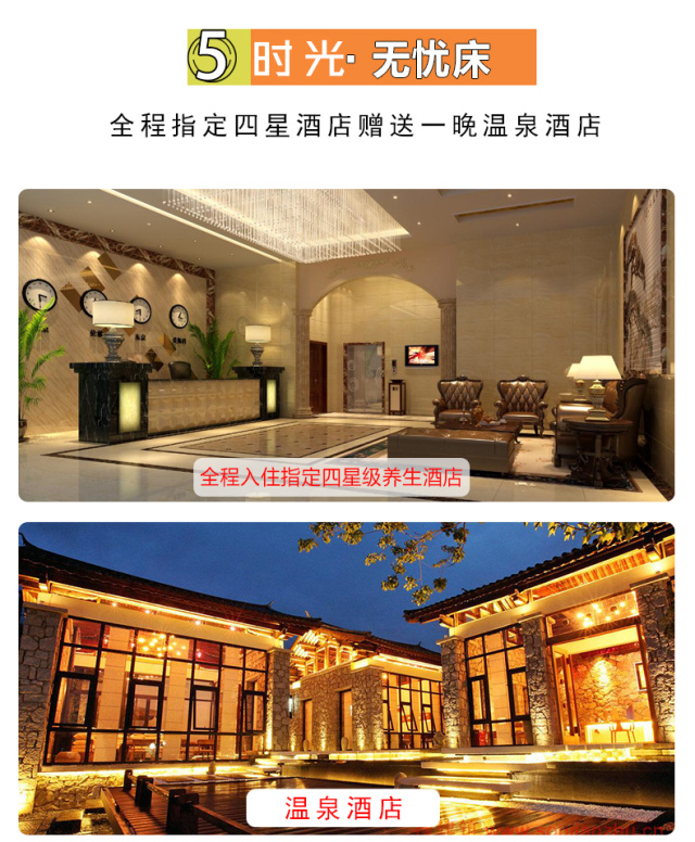住宿:全程指定四星酒店赠送一晚温泉酒店。