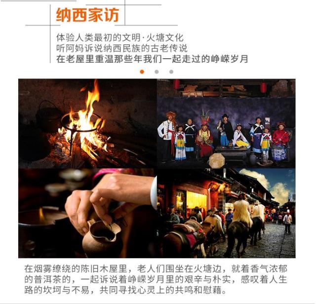 早餐后,乘车前往丽江(车程约2小时),首先前往【三股水景区】(游览时间90分钟),丽江三股水冒金地,是集山水、峡谷、田园风光等自然景观和茶马古街、纳西村落、纳西风情等人文景观于一体的 风景区,是旧时茶马古道通往丽江和入藏的三岔路口。三股水冒金地是茶马古道重地,风情自然纯朴、依山傍水、环境优美;中餐后游览【束河古镇】(游览时间60分钟),束河古镇,纳西语称"绍坞",因村后聚宝山形如堆垒之高峰,以山名村,流传变异而成,意为"高峰之下的村寨",是纳西先民在丽江坝子中最早的聚居地之一,是茶马古道上保存完好的重要集镇,也是纳西先民从农耕文明向商业文明过渡的活标本,是对外开放和马帮活动形成的集镇建设典范。【参观螺旋藻配送中心】,之后前往纳西农家参加【纳西家访】(时间60分钟),在这里您可以和纳西族的同龄老人围坐在火塘边,煮上一壶普洱茶,大家一起聊聊当年的往事;今天的晚餐为您安排的是【丽江马帮宴】,丽江作为茶马古道重镇,餐饮文化自然集各族之长,独具特色,您可以品尝到各种具有地方特色的马帮菜肴,晚餐后可自费欣赏由杨丽萍编导的【丽水金沙】,晚上入住丽江为您准备的养生酒店。