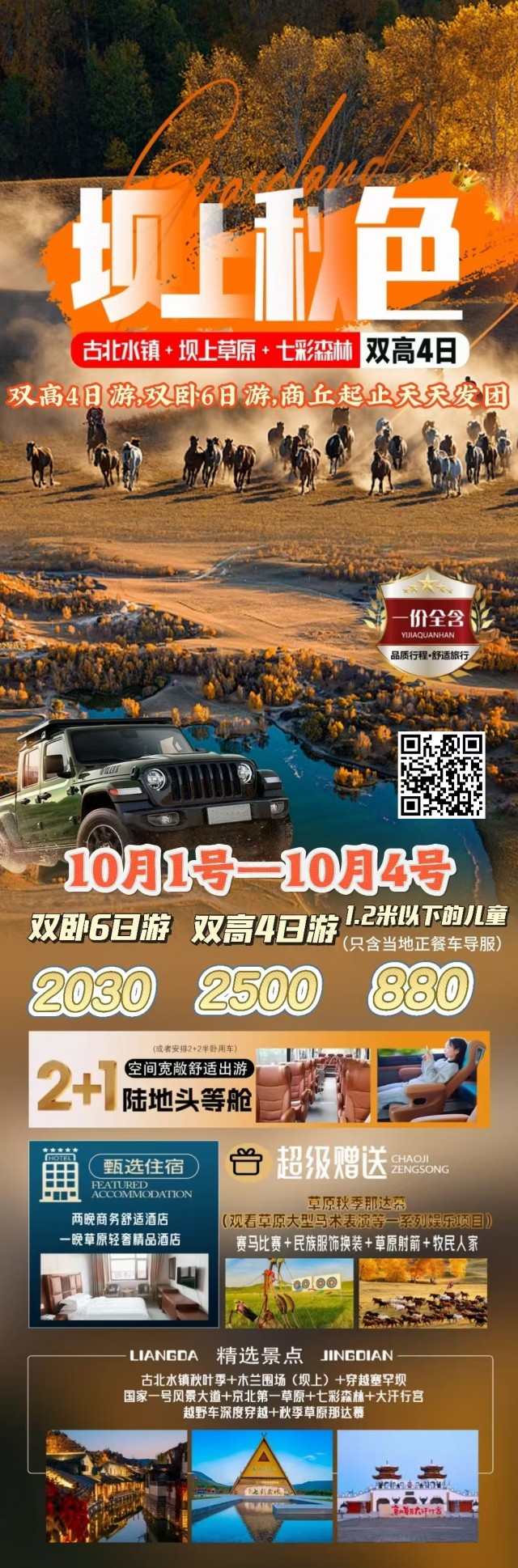 北京--坝上秋色:古北水镇、坝上草原、草原盛会那达慕、越野车草原深度穿越、神仙谷.七彩森林公园、大汗行宫外观(0自费)双卧6日游、双高4日游、商丘起止发团
