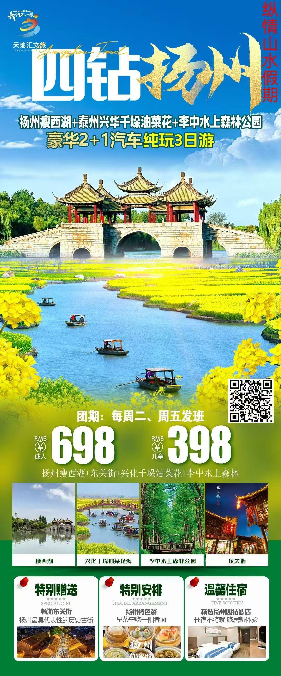 江苏--【四钻扬州】东关街+扬州瘦西湖+千垛花海+李中森林公园纯玩汽车三日游