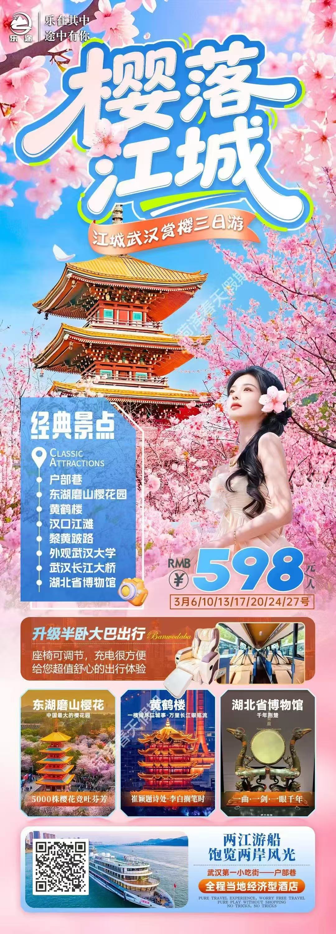 湖北--【樱落江城】黄鹤楼+东湖磨山+长江大桥轮渡+武汉大学+湖北博物馆纯玩三日游