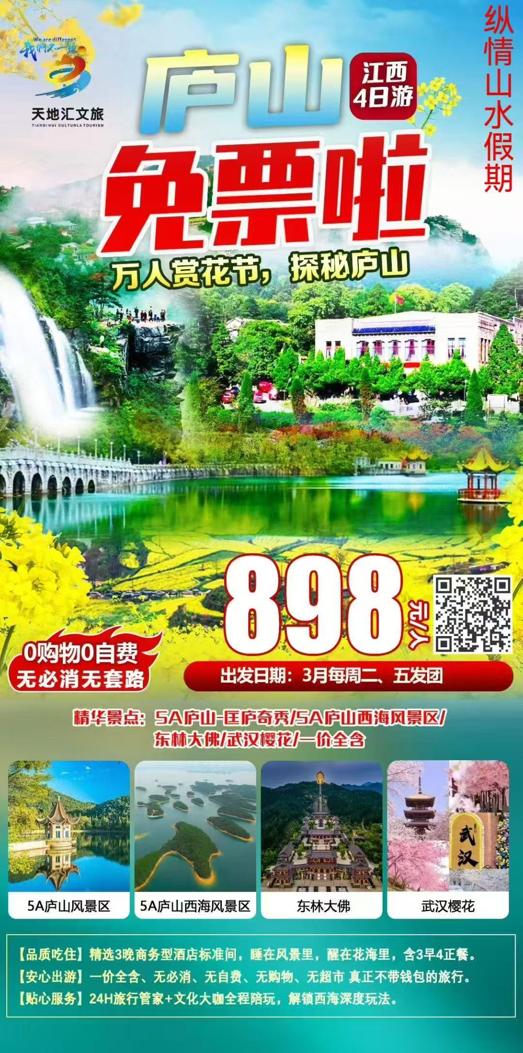 江西--【至尊全含】【3月免票季-春游庐山-武汉赏樱】秀丽庐山*诗画西海*东林大佛*武汉樱花纯玩4日游