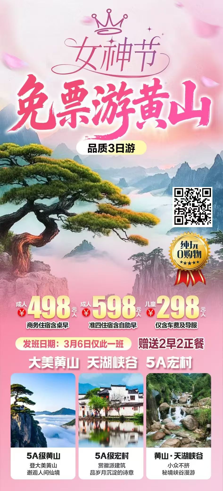 安徽---女神节免票 黄山、宏村、天湖峡谷三日游