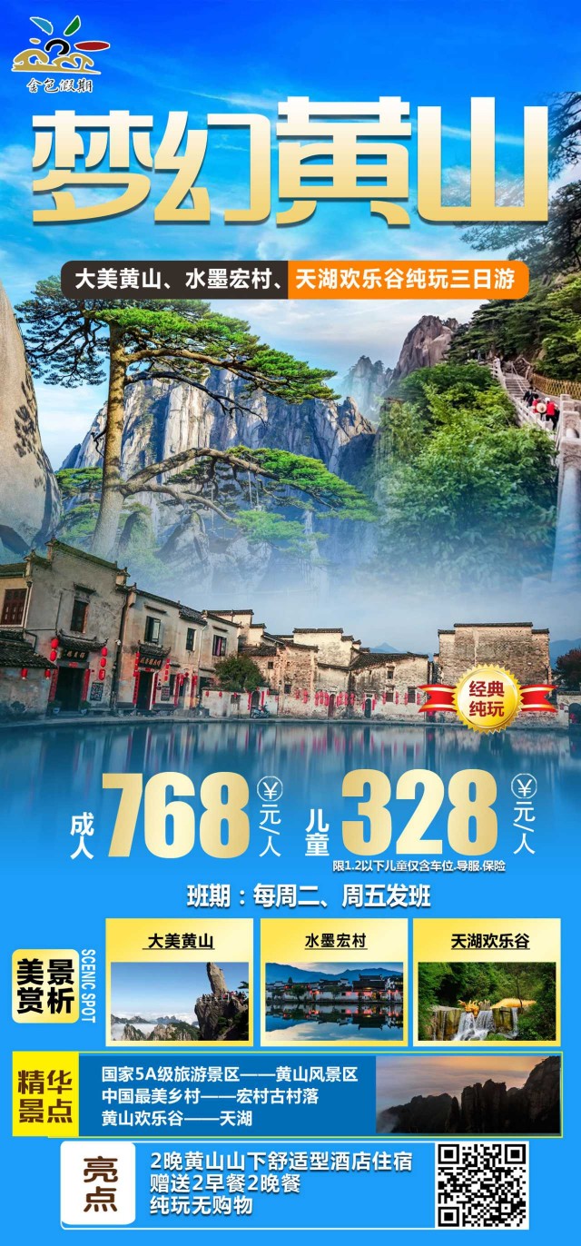 安徽--大美黄山、水墨宏村、天湖峡谷纯玩三日游